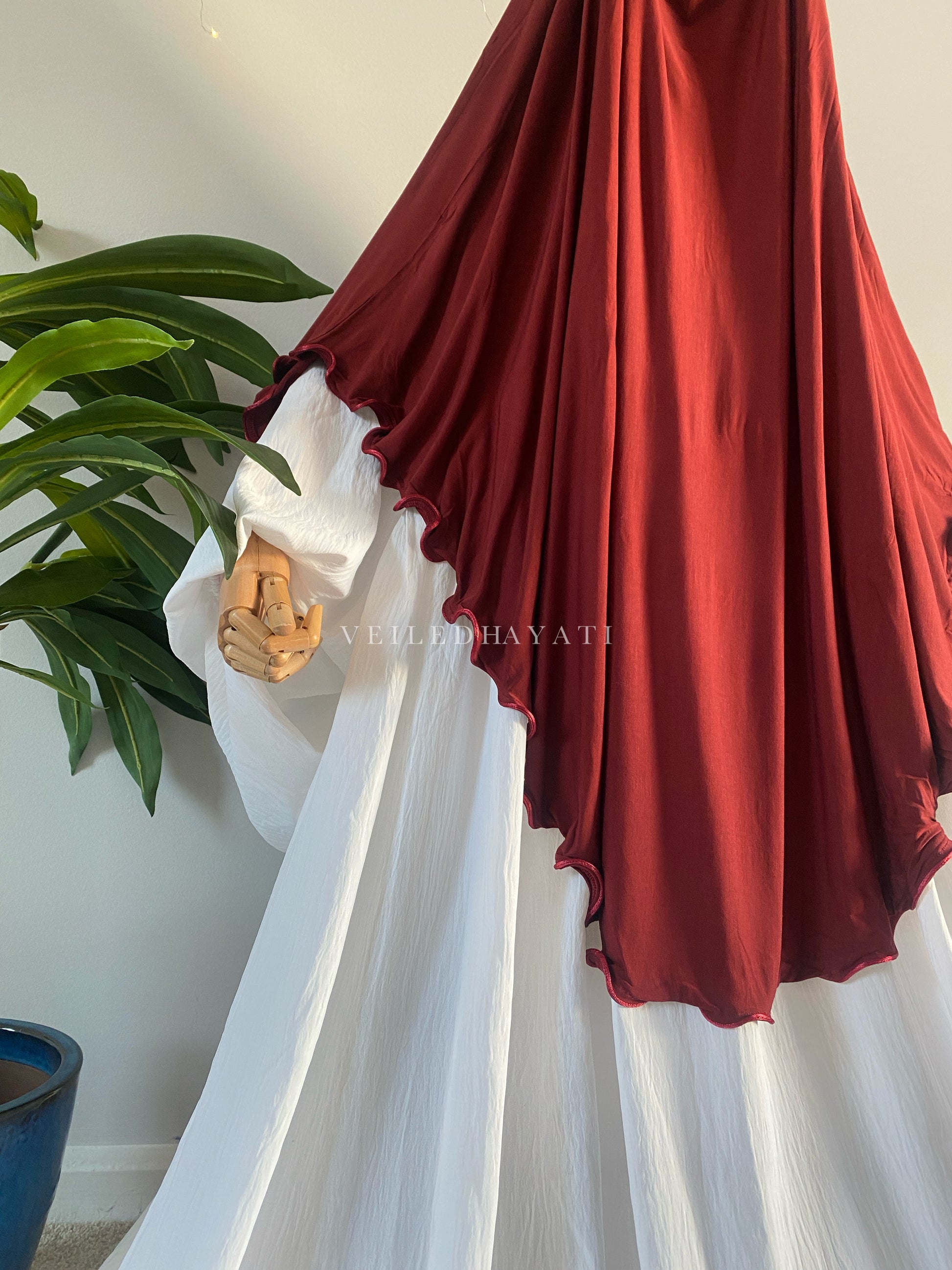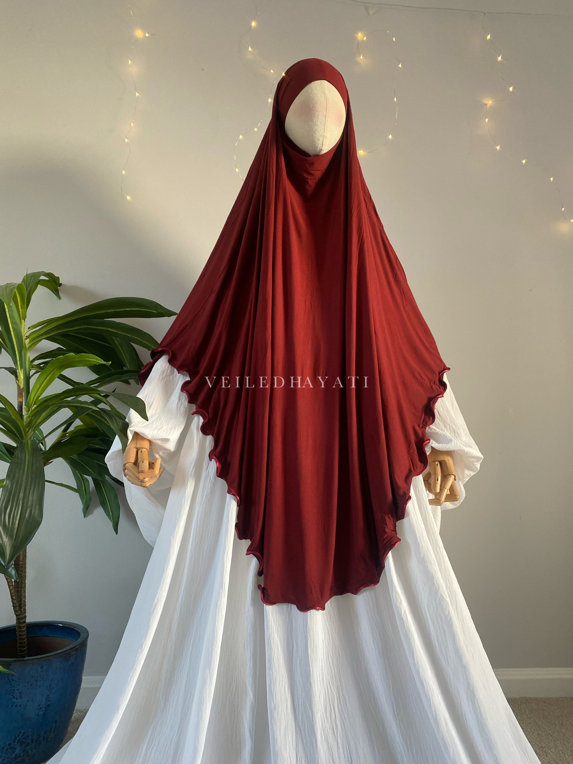 this was one of my first khimars that I bought from veiledhayati, and I must say…i felt like a princess for the very first time!1!1! as someone who has been on a literal HUNT to find the right khimars or hijab styles, and have been constantly feeling down as it doesn’t reach my expectations or doesn’t look good on me (the effects of being a perfectionist unfortunately 😖) TRUSTTT this will satisfy you! the jersey fabric is nice and stretchy, not too heavy at all on the head and there’s no bumps or weird pointy sides on the khimar (ifykyk) + small lil’ caution, that the niqab bit shows the shape of your nose and sometimes your lips, which is inevitable because the fabric is jersey—but overall, a lovely purchase! 💕