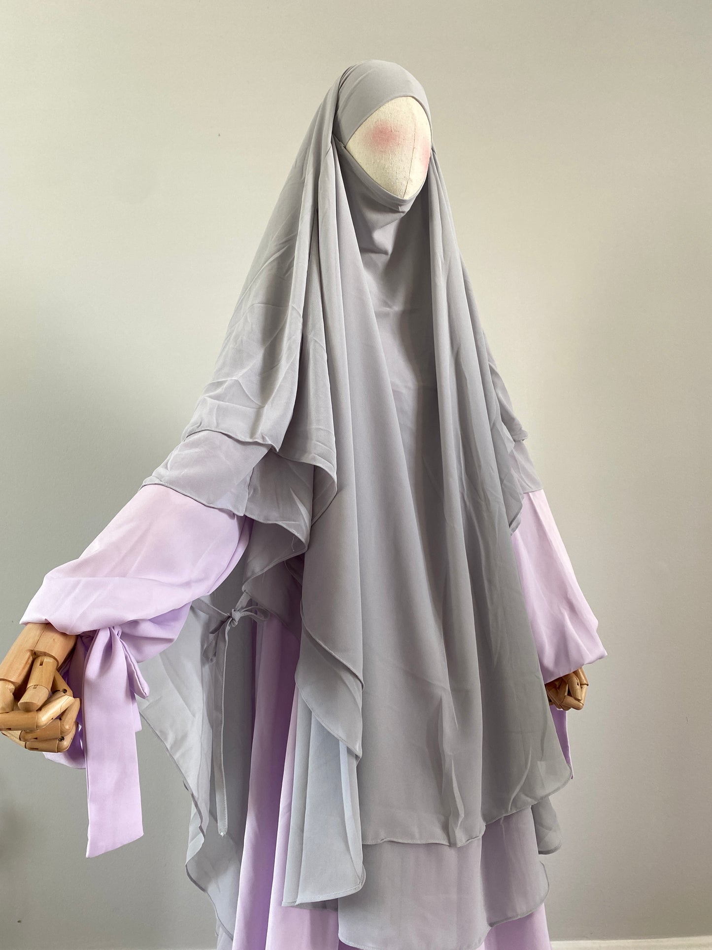 🎀 The back and last layer of the khimar is about 53 inches from head down to the last layer. (If you are below 4'11, the back of the khimar will likely touch the ground!).